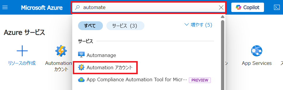 - Azure ポータルで 「Automation」 を検索し、[Automation アカウント] をクリックします。