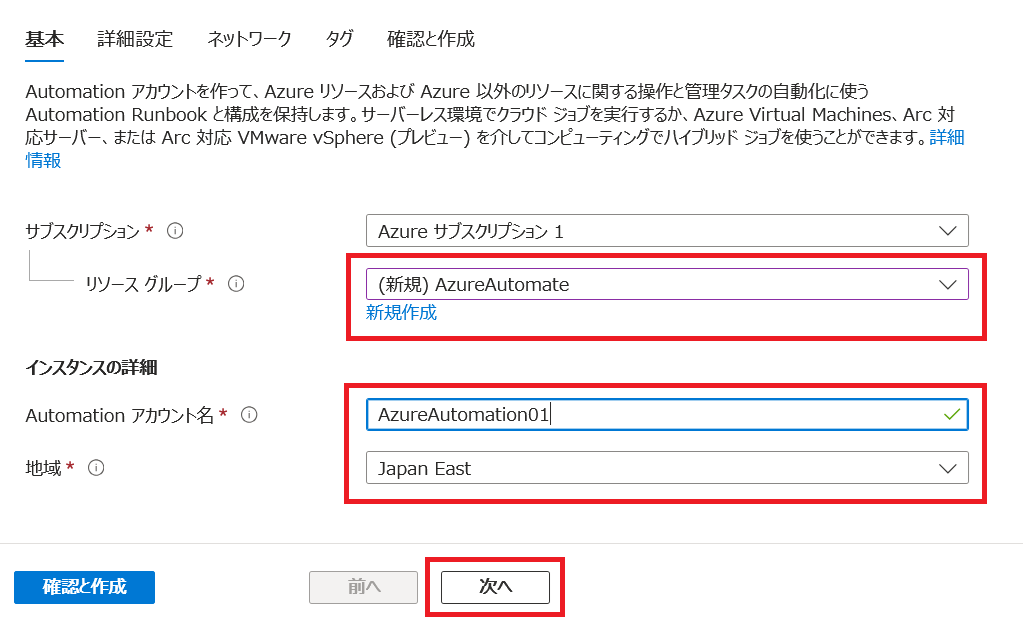 - [基本] タブでは、リソース グループを作成し Automation アカウント名、地域を設定します。[次へ] をクリックします。