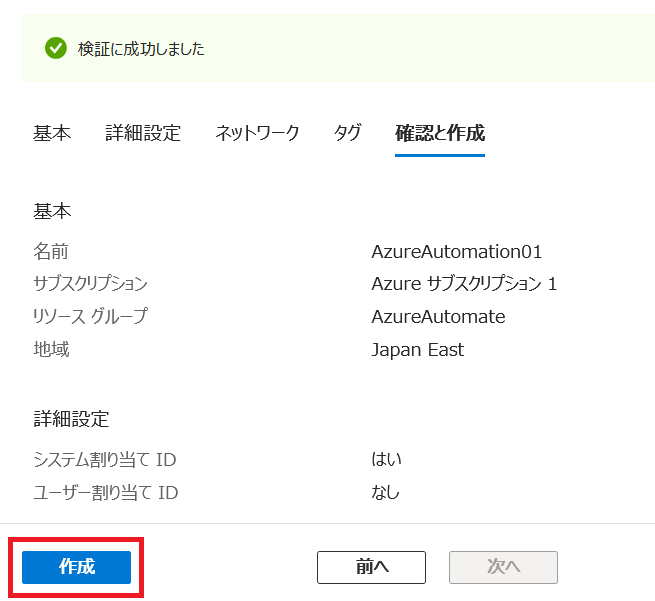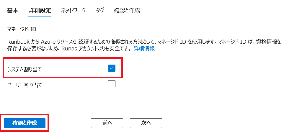 - [詳細設定] タブでは、マネージド ID の設定にて 「システム割り当て」 が選択されていることを確認し、[確認と作成] をクリックします。「システム割り当て」 を選択することで、この Automation 専用のマネージド ID が自動生成されます。