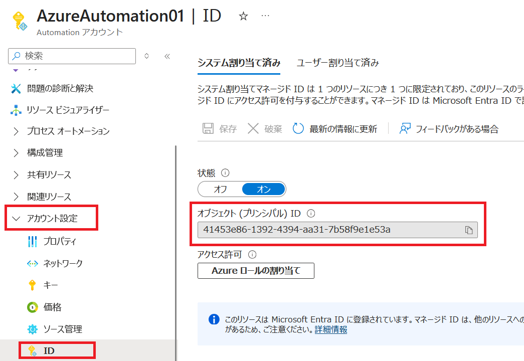 - Automation アカウント画面の [アカウント設定] – [ID] をクリックします。表示されたオブジェクト (プリンシパル) ID をコピーし、メモ帳などに張り付けておきます。