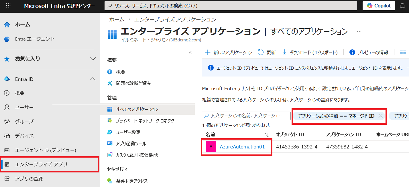 以下のスクリプトをコピーし、メモ帳に貼り付けして<オブジェクト ID>を書き換えます。# ========================================================= # 📝 設定セクション:<オブジェクト ID> を書き換えてください # ========================================================= $ManagedIdentityObjectId = "<オブジェクトID>" $RoleNames = @("Reports.Read.All", "Sites.Read.All", "Files.ReadWrite.All") $GraphAppId = "00000003-0000-0000-c000-000000000000" # ========================================================= # 1. 必要なスコープを指定して Microsoft Graph に接続 Write-Host "--- Microsoft Graphに接続しています ---" -ForegroundColor Cyan $AuthScopes = @("AppRoleAssignment.ReadWrite.All", "Application.Read.All") Connect-MgGraph -Scopes $AuthScopes -NoWelcome # 2. Graph APIのサービスプリンシパル情報を取得 $GraphSp = Get-MgServicePrincipal -Filter "AppId eq '$GraphAppId'" # 3. 権限付与ループ $ErrorActionPreference = "SilentlyContinue" # 既に付与済みの赤エラーを非表示にする foreach ($RoleName in $RoleNames) { $AppRole = $GraphSp.AppRoles | Where-Object { $_.Value -eq $RoleName -and $_.AllowedMemberTypes -contains "Application" } if ($AppRole) { $Params = @{ PrincipalId = $ManagedIdentityObjectId; ResourceId = $GraphSp.Id; AppRoleId = $AppRole.Id } New-MgServicePrincipalAppRoleAssignment -ServicePrincipalId $ManagedIdentityObjectId @Params Write-Host "✅ $RoleName の付与処理を実行しました。(既に付与済みの場合はスキップされます)" -ForegroundColor Green } } $ErrorActionPreference = "Stop" # エラー設定を元に戻す Write-Host "✅ すべての事前準備(権限付与)が完了しました!" -ForegroundColor Yellow - Microsoft Entra 管理センターの [エンタープライズ アプリ] をクリックし、「アプリケーションの種類」 フィルターを 「マネージド ID」 のみに変更します。