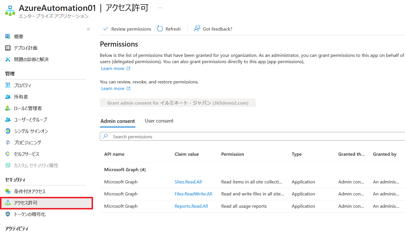 作成されたマネージド ID が Microsoft 365 に接続して操作を行うには、Microsoft Graph API への 「アクセス許可」 を付与する必要があります 。
