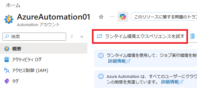 - Azure Automation 概要画面の [ランタイム環境エクスペリエンスを試す] をクリックします。ランタイム環境に切り替えることで、Azure Automate で PowerShell 7.4 が利用できるようになります。