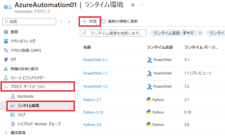 - [プロセス オートメーション] – [ランタイム環境] – [作成] をクリックします。