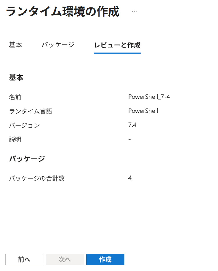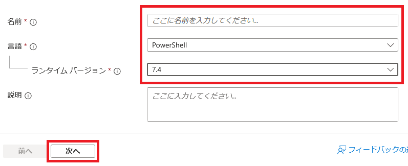 - 名前と言語を設定します。言語は 「PowerShell」、ランタイム バージョンは 「7.4」 を選択します。[次へ] をクリックします。