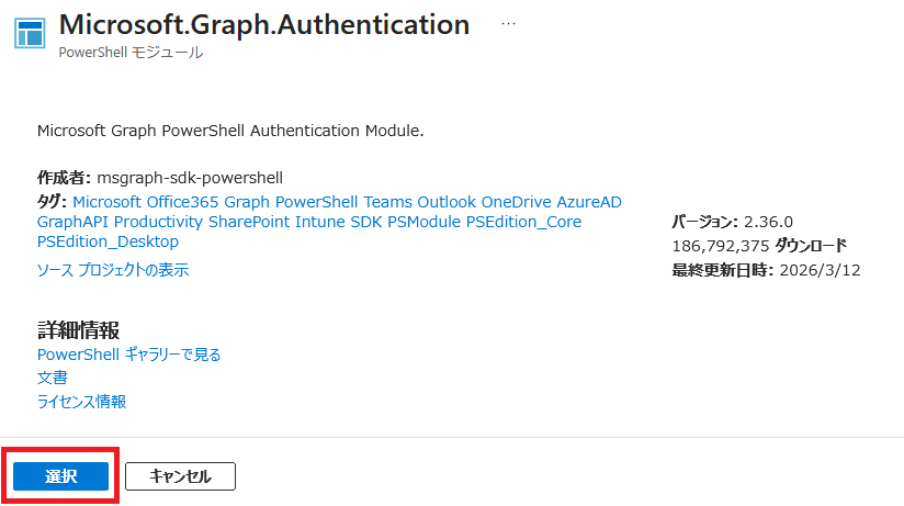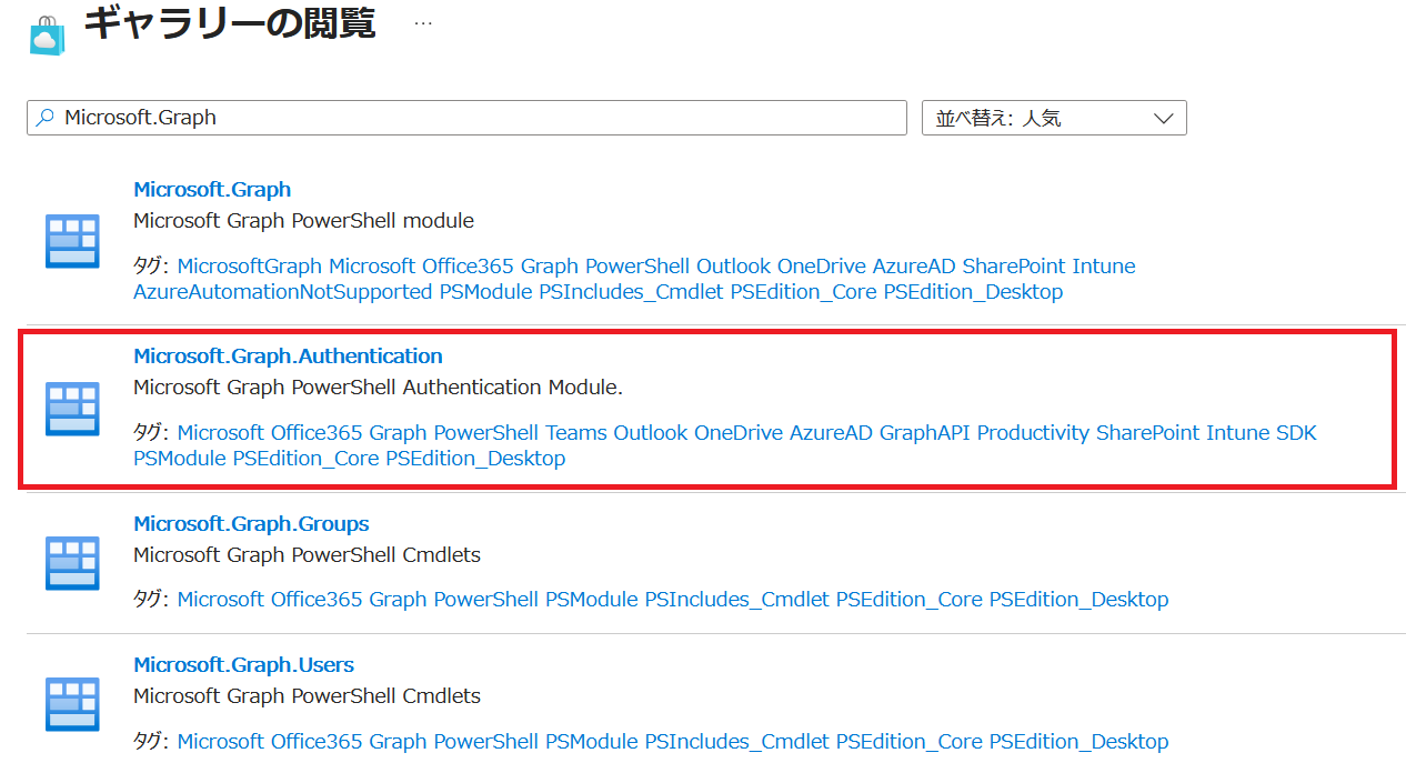 - 今回の操作に必要なモジュールは 「Microsoft.Graph.Authentication」、「Microsoft.Graph.Sites」 です。「Microsoft.Graph」 で検索し、一覧から 「Microsoft.Graph.Authentication」 をクリックします。