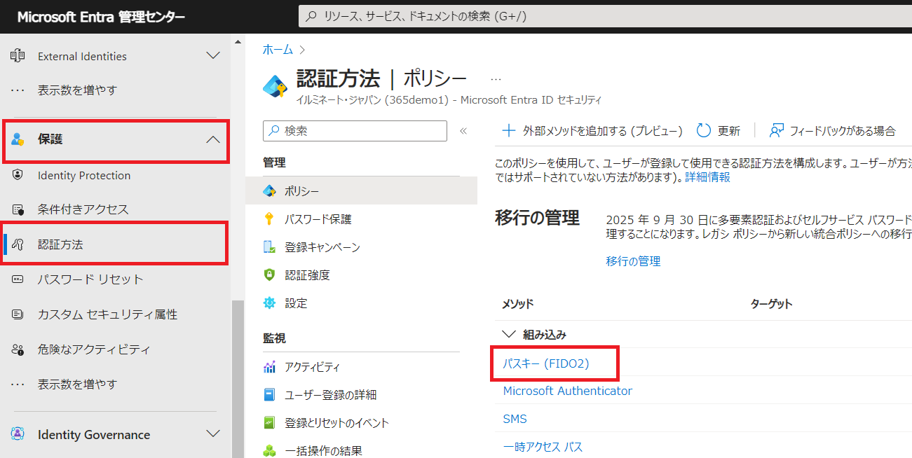 - Microsoft Entra 管理者センターにアクセスし、[保護] – [認証方法] – [パスキー (FIDO2)] をクリックします。