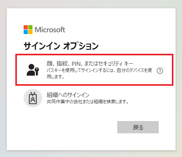 - [顔、指紋、PIN、またはセキュリティ キー] を選択。